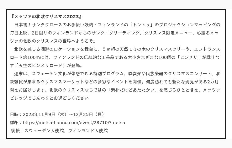 「メッツァの北欧クリスマス2023」情報公開第三弾