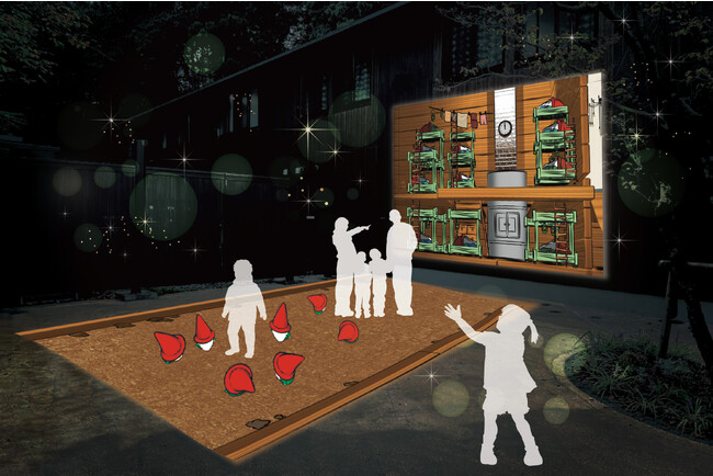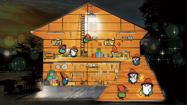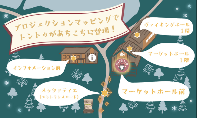 トントゥたちは、マーケットホール壁面のプロジェクションマッピングのメイン会場を中心に、エントランスロードや建物内など計5か所に登場。ビレッジ内のあちらこちらでトントゥたちの気配を感じてみてください♪