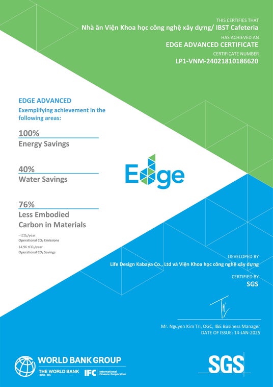 ライフデザイン・カバヤ株式会社(代表取締役社長:窪田健太郎/本社:岡山県岡山市)は、ベトナム建設省傘下の建設科学技術所(IBST)と連携し、ベトナム ハノイ市で建築したIBST木造モデルハウスで、国際的なグリーンビルディング認証制度のひとつである「EDGE」(Excellence in Design for Greater Efficiencies)認証の「EDGE Advanced(EDGEアドバンス)」を2025年1月14日に取得しました。