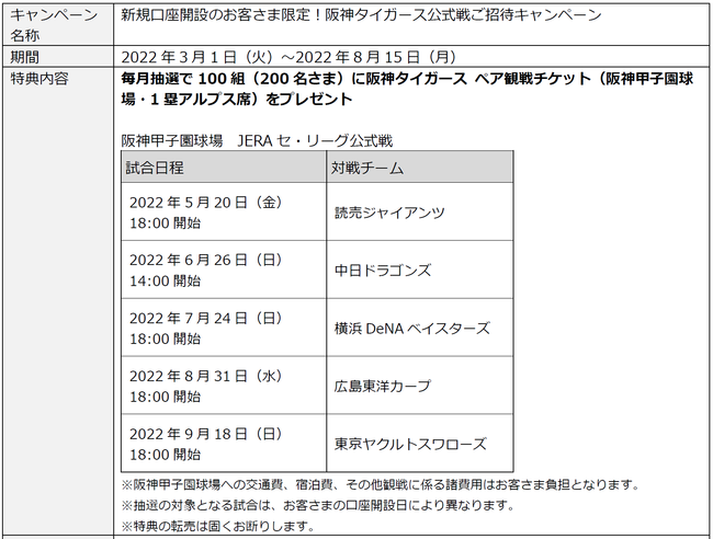 キャンペーン期間中に新規で口座開設完了のうえ、円普通預金残高1万円以上かつキャンペーンにエントリーいただいたお客さまの中から、抽選で毎月100組(200名さま)に、阪神タイガース公式戦のペア観戦チケット(阪神甲子園球場)をプレゼントします。