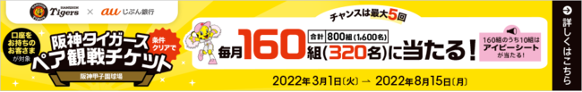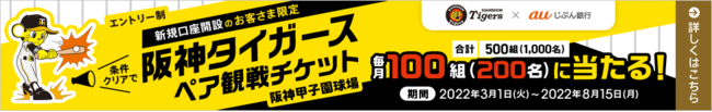 auじぶん銀行口座をお持ちのお客さまのうち、円普通預金残高1万円以上かつキャンペーンにエントリーいただいたお客さまの中から、抽選で毎月160組(320名さま)に阪神タイガース公式戦のペア観戦チケット(阪神甲子園球場)をプレゼントします。