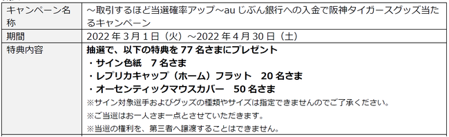 3.「 ~取引するほど当選確率アップ~ auじぶん銀行への入金で阪神タイガースグッズ当たるキャンペーン 」 について