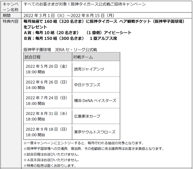 1.「すべてのお客さまが対象!阪神タイガース公式戦ご招待キャンペーン」について