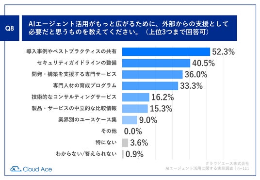 「Q8.AI エージェント活用がもっと広がるために、外部からの支援として必要だと思うものを教えてください。(上位 3 つまで回答可)」(n=111)と質問したところ、「導入事例やベストプラクティスの共有」が 52.3%、「セキュリティガイドラインの整備」が 40.5%、「開発・構築を支援する専門サービス」が 36.0%という回答となりました。