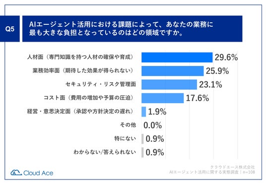 Q3で「特にない」「わからない/答えられない」以外を回答した方に、「Q5.AI エージェント活用における課題によって、あなたの業務に最も大きな負担となっているのはどの領域ですか。」(n=108)と質問したところ、「人材面(専門知識を持つ人材の確保や育成)」が 29.6%、「業務効率面(期待した効果が得られない)」が 25.9%、「セキュリティ・リスク管理面」が 23.1%という回答となりました。