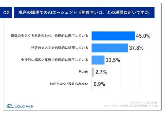 「Q2.現在の職場での AI エージェント活用度合いは、どの段階に近いですか。」(n=111)と質問したところ、「複数のタスクを組み合わせ、自律的に運用している」が 45.0%、「特定のタスクを自律的に処理している」が 37.8%という回答となりました。