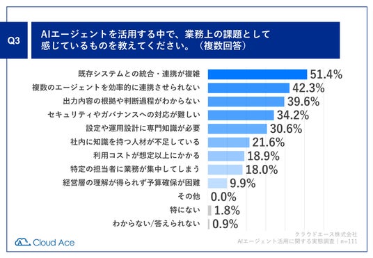「Q3.AI エージェントを活用する中で、業務上の課題として感じているものを教えてください。(複数回答)」(n=111)と質問したところ、「既存システムとの統合・連携が複雑」が 51.4%、「複数のエージェントを効率的に連携させられない」が 42.3%、「出力内容の根拠や判断過程がわからない」が 39.6%という回答となりました。