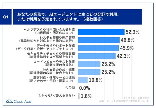 「Q1.あなたの業務で、AI エージェントは主にどの分野で利用、または利用を予定されていますか。(複数回答)」(n=111)と質問したところ、「ヘルプデスクや社内問い合わせ対応(内容理解~回答作成まで)」が 52.3%、「システム監視や運用管理(異常検知から対応まで自律的に実行)」が 46.8%、「データ分析やレポート作成(データ収集~分析~アウトプットまで)」が 45.9%という回答となりました。