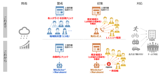 本実証ではWinActor(RPAツール)を利用し、システム上の土壌雨量指数を監視し、閾値を超えた場合にはelgana(ビジネスチャット)を経由して職員へ通知を行える形にしました。