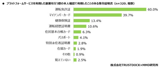次に、プラットフォームサービスを利用した副業の際に本人確認を行ったと回答した320人を対象に、本人確認に利用したことのある身分証明書を聞いたところ(複数回答可)、「運転免許証」が60.0%と最も多く、次いで「マイナンバーカード」が39.7%、「健康保険証」が13.4%となった。