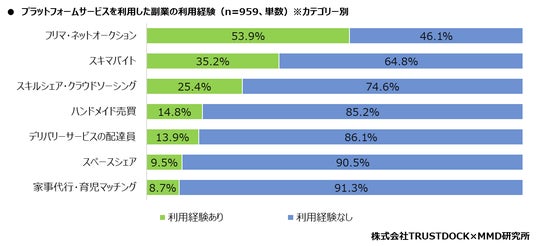 次に、プラットフォームサービスを利用した副業経験があると回答した959人を対象に、プラットフォームサービスを利用した副業の利用経験について聞いたところ、フリマ・ネットオークションが53.9%と最も多く、次いでスキマバイトが35.2%、スキルシェア・クラウドソーシングが25.4%となった。