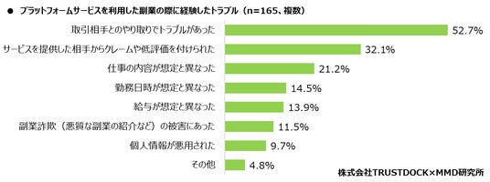 次に、プラットフォームサービスを利用した副業の際にトラブルを経験したことがあると回答した165人を対象に、経験したトラブルについて聞いたところ(複数回答可)、「取引相手とのやり取りでトラブルがあった」が52.7%と最も多く、次いで「サービスを提供した相手からクレームや低評価を付けられた」が32.1%、「仕事の内容が想定と異なった」が21.2%となった。