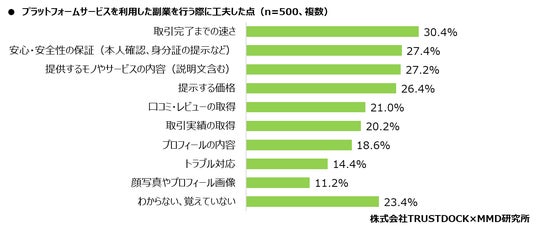 プラットフォームサービスを利用した副業をメインで行ったことがあると回答した500人を対象に、工夫した点を聞いたところ(複数回答可)、「取引完了までの速さ」が30.4%と最も多く、次いで「安心・安全性の保証(本人確認、身分証の提示など)」が27.4%、「提供するモノやサービスの内容(説明文含む)」が27.2%となった。