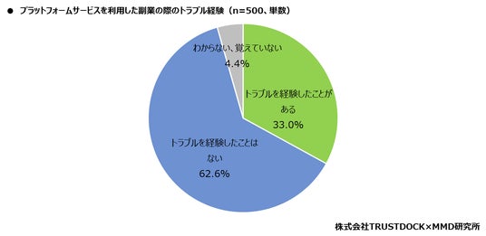 予備調査からプラットフォームサービスを利用した副業をメインで行ったことがあると回答した500人を抽出し、トラブル経験について聞いたところ、「トラブルを経験したことがある」が33.0%、「トラブルを経験したことはない」が62.6%となった。