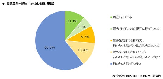 20~69歳の男女20,000人を対象に、副業経験について「分からない、答えられない」と回答した人を除いた16,485人の副業意向~経験までを聞いたところ(「わからない、答えられない」を除く)、「現在行っている」と「過去行っていたが、現在は行っていない」を合わせた副業経験者は16.8%となった。「勤め先で許可されており、行いたいと思っているが行ったことはない」と「勤め先で許可されておらず、行いたいと思っているが行ったことはない」を合わせた副業意向があるが未経験の人は22.7%となった。