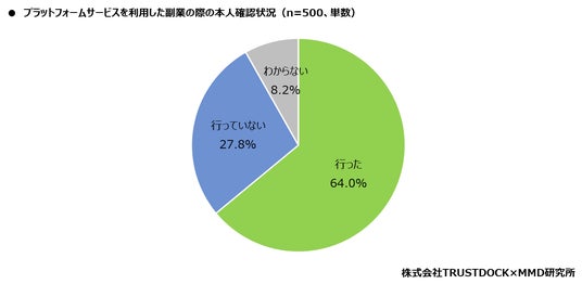 プラットフォームサービスを利用した副業をメインで行ったことがあると回答した500人を対象に、プラットフォームサービスを利用した副業の際に本人確認を行ったかどうかを聞いたところ、「行った」が64.0%、「行っていない」が27.8%となった。
