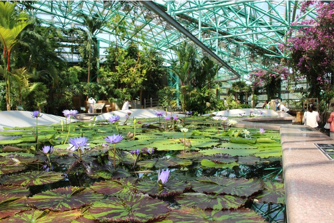アトリウム(温室)で栽培されているスイレンは熱帯性スイレンで、午後3時頃には花が閉じてきます。
