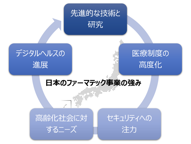 日本におけるファーマテックの強みとして、先進的な技術と研究、高度化した医療制度、セキュリティへの注力、高齢化社会に対するニーズ、そしてデジタルヘルスの進展が挙げられます。これらの要因により、ファーマテックの普及と発展が日本において非常に有利な環境下で進んでいると言えるでしょう。