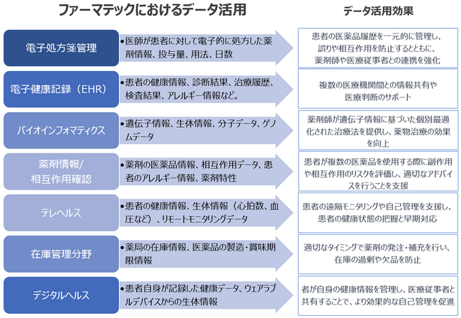 これらの具体的な分野におけるデータの保管と共有は、ファーマテックの中核的な機能であり、医療の質の向上と患者セントリックなケアの実現に向けて重要な要素となっています。以下では、ファーマテックが医療分野において果たす役割とデータ活用について、説明します。