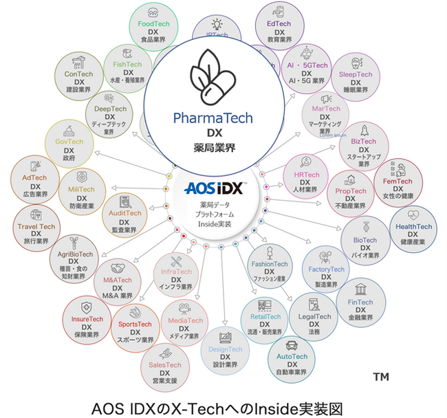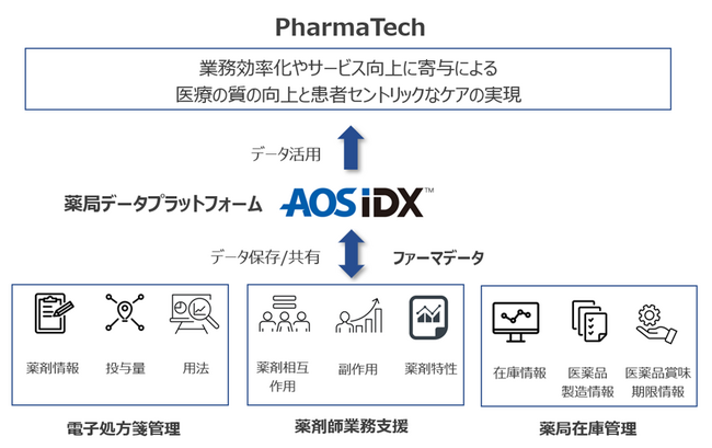 クラウドデータ、システムデータ、リーガルデータ、AIデータなどのデータアセットマネジメント事業を展開するAOSデータ株式会社(本社:東京都港区、代表取締役社長 春山 洋 以下 AOS データ社)は、PharmaTechにおいて、薬局における処方箋の受付、調剤業務、薬剤情報の提供などの多大な対物業務に費やされる時間を削減し、患者と直接向き合う対人業務にシフトし、薬剤師や医療機関がより効率的な薬局経営を実現するために、薬局データの保存管理やデータのリスク管理までデータを総合的にマネジメントし、AIによるデータ分析や活用につなげることができるデータマネジメント製品「薬局データプラットフォームAOS IDX」(https://AOSIDX.jp/)のInside実装サービスを、2023年8月8日より販売開始することをお知らせします。