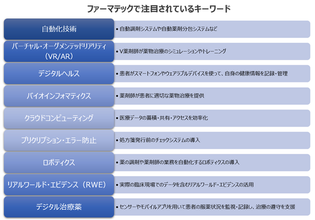また、医療分野においてさまざまな技術とトレンドが注目を集めています。自動化技術、データプラットフォームとデータ解析、リモートヘルスケア、AIと機械学習、VR/AR技術、ブロックチェーン技術、そしてバイオインフォマティクスなどがファーマテックの主要な注目ポイントとなっています。これらの技術とトレンドは、薬局業界におけるデジタル化と革新を促進し、薬剤師の業務においてより高度な専門性を発揮し、患者により質の高い医療サービスを提供するために積極的に導入されています。