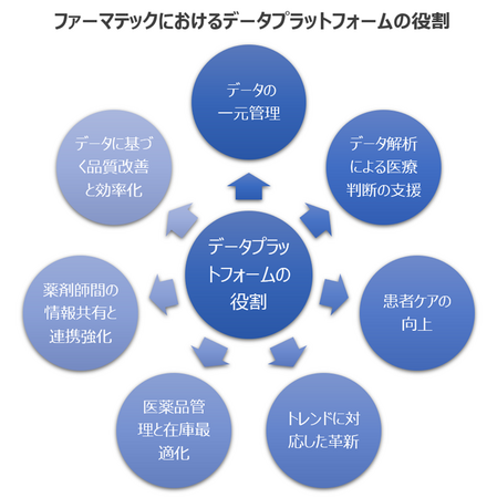 ファーマテックにおいてデータプラットフォームは重要な役割を果たし、データの収集、統合、解析、共有、保護などの側面で薬局における情報の統合と共有、データ駆動型の医療判断、患者セントリックなケア、医薬品管理と在庫最適化など、薬局はより効率的で質の高い医療サービスを提供し、患者の健康と福祉に寄与することが可能となります。