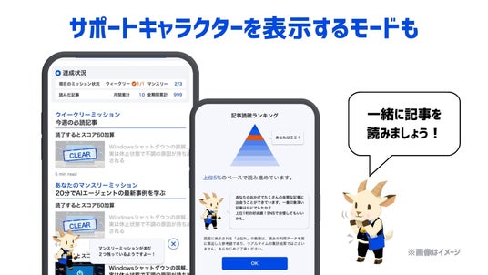 さらに、ミッション達成や記事読了をサポートするナビゲーションキャラクターをアプリに表示するモードも。ミッションの進捗状況やランクについてコメントをしてくれるほか、ミッション達成のコツをつぶやき、楽しく進められます。