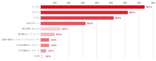 レイクと同じ大手の消費者金融を比較対象としている人が多かった。レイクの金利はもちろん、審査や手続きの利便性・スピードなどを比べていると考えられる。