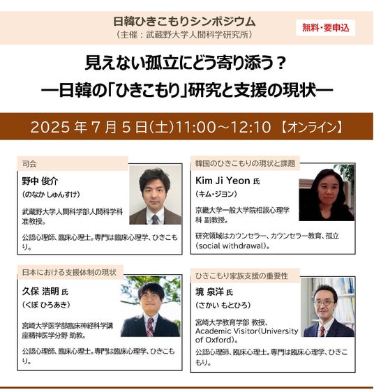 武蔵野大学人間科学研究所(所長:辻 惠介)は7月5日(土)に日韓の研究者によるミニ・シンポジウム「見えない孤立にどう寄り添う? 日本と韓国のひきこもり研究と支援の現状」を開催します。