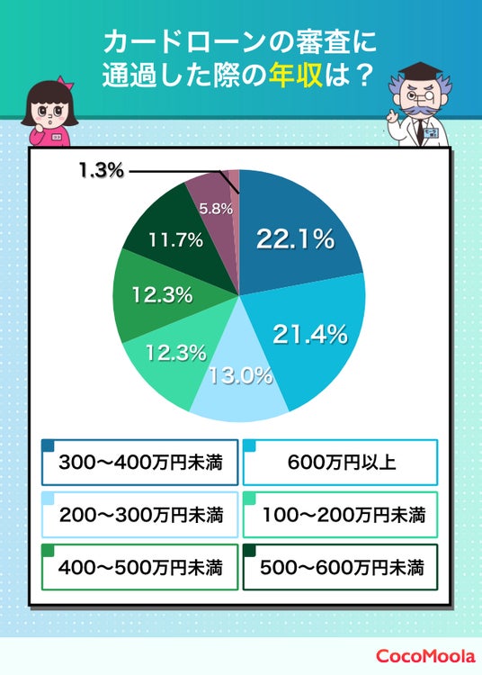 - カードローンの審査に通った際の年収で最も多かったのは「300~400万円未満」で約22%。次いで「600万円以上」が約21%を占める。