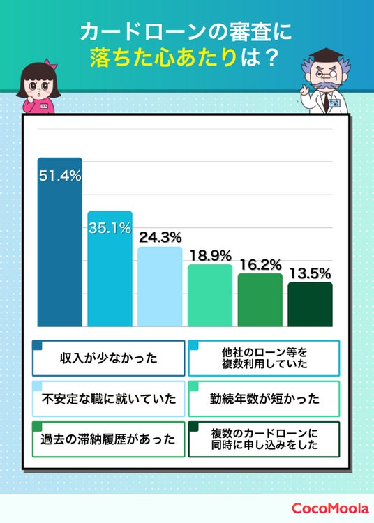 - 「カードローンの審査に落ちた経験がある」と答えたのは約24%。そのうち約51%が「収入が少なかった」ことが審査に落ちた要因だと振り返っている。