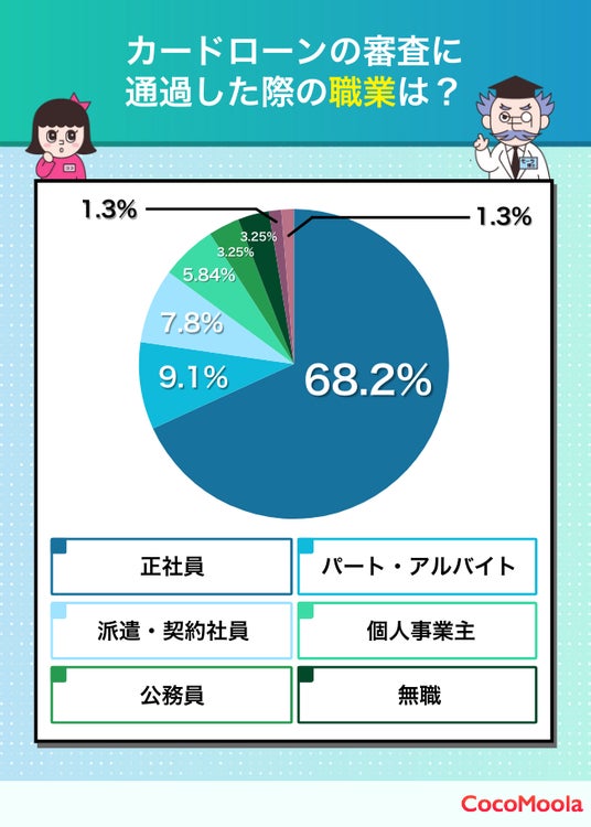 - カードローンの審査に通った際の職業・雇用形態で最も多かったのは「正社員」で約68%。一方で「パート・アルバイト」や「派遣・契約社員」などの非正規雇用で審査に通過した人は約17%存在する。