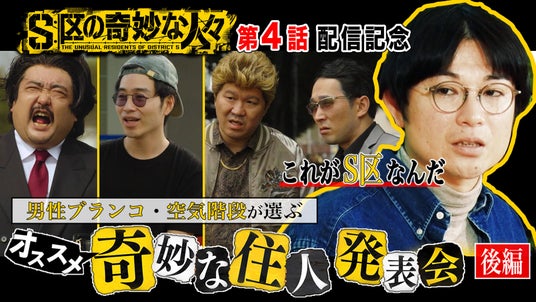 さらにこの度、第4話の配信を記念し、男性ブランコと空気階段の特別鼎談<後編>の映像が到着!それぞれがイチオシの「S区」住人キャラクターの紹介や、共演したジャルジャル、シソンヌの印象についてたっぷり語っている。2組が満場一致で絶賛するのは、この次の第5話に登場する、ジャルジャルのコント「ダンスサークルの人」。新入生(ジャルジャル福徳)に無理やりダンスを踊らせる謎の男(ジャルジャル後藤)といういかにも奇妙な設定のコントで、嫌々踊り続ける福徳と嬉々としてそれを見ている後藤の姿が爆笑をさそう一本だ。男性ブランコ平井は「これを台本で起こしていたらぞっとするぐらい」とジャルジャルの掛け合いを絶賛するが、なんと実際の台本には「ダンスする」しか書かれていないことが発覚し、鼎談は大盛り上がり!超人気コント師の2組も感服するジャルジャルのコントにも乞うご期待。