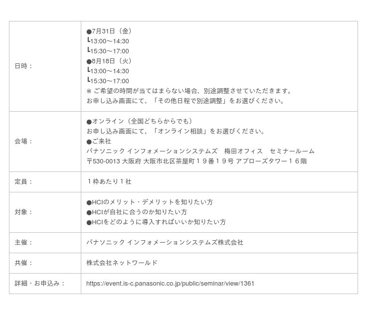 パナソニック インフォメーションシステムズ株式会社は、2020年7月31日(金)、2020年8月18日(火)に ハイパーコンバージドインフラ(HCI)にフォーカスした個別相談会を開催します。