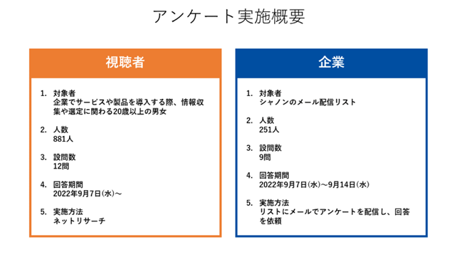 シャノンでは、2021年9月にウェビナーに対するイメージと参加状況について、アンケートを実施しました。その後2022年になり「1年前と参加状況に変化はあるのか」「企業の実施状況とのギャップはあるのか」を調査したいと考え、2022年9月に再度アンケートを実施し、結果を経年比較しました。