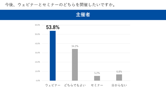 ウェビナ―の主催者へ、今後、ウェビナーとセミナーのどちらを開催したいかを尋ねたところ、53.8%がウェビナーと回答しました。次いでどちらでもよいは34.2%、セミナーは5.2%と、ウェビナーを開催したい企業が多いことがわかりました。