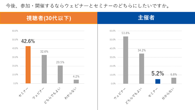 30代以下の視聴者で「ウェビナー」より「セミナー」に参加したい人は4割超えの一方、主催者で「ウェビナー」より「セミナー」を開催したい人は5%とギャップが見られました。若年層はアナログ回帰傾向にあるものの、すべての年代でみると視聴者側はアナログ・デジタル両方での情報提供を求めているため、ウェビナーのみならずセミナーにも注力が必要と言えます。