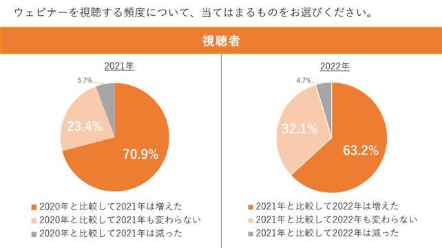 ・視聴者の6割が「2021年と比較して2022年はウェビナーの視聴頻度が増えた」と回答し、2021年につづき増加傾向