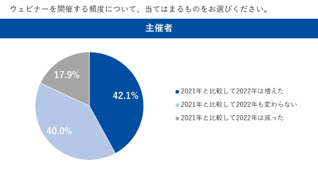 ウェビナーの主催者である企業に開催頻度を尋ねたところ、「2021年と比較して2022年は増えた」と回答した人が42.1%、「2021年と比較して2022年も変わらない」と回答した人が40.0%となりました。