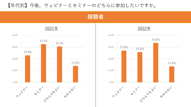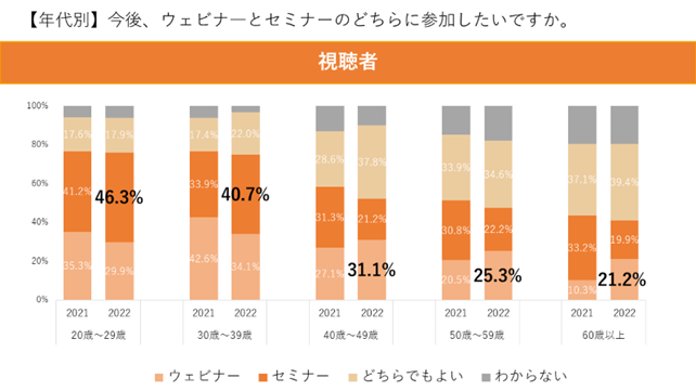 今後参加するなら、視聴者は「ウェビナーとセミナーどちらでもよい」と回答した人が最多の3割で、アナログ・デジタルの情報収集をどちらも希望する傾向が見られました。年代別でみると、2021年は30代以下がウェビナーを選択するデジタル傾向、40代以上がセミナーを選択するアナログ傾向だったのに対し、2022年は30代以下がアナログ傾向、40代以降がデジタル傾向と逆転しており、ウェビナーが全年代に浸透してきた一方で、若年層のアナログ回帰傾向があるといえます。