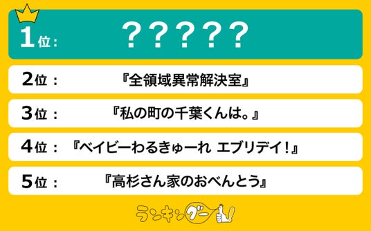 2位は主人公が“不可解な異常事件”に挑む『全領域異常解決室』。3位はトライアングル・ラブストーリー『私の町の千葉くんは。』。4位はアクションコメディの『ベイビーわるきゅーれ エブリデイ!』そして、5位には柳原望さんによる漫画が原作の『高杉さん家のおべんとう』がランクインしました。