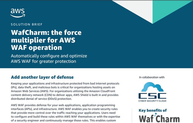 当社は、このような背景からWAFの運用負荷を軽減するために、2021年11月から米国にて『WafCharm』を展開しており、この度、さらなる展開を強化する施策の第1弾目として、AWSに当社の『WafCharm』に関するチラシを作成していただきました。