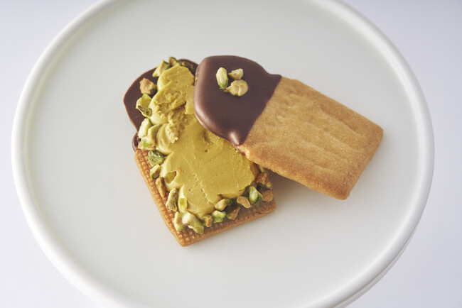 生クリーム入りのバタークリームに高品質なイタリア製ピスタチオペーストをたっぷりと混ぜ合わせ、ミルクチョコレートをかけたビスケットで挟みました。ローストして香ばしさをアップさせたピスタチオナッツを砕いてまぶし、食感と味のアクセントに。ナッツ本来の風味が口いっぱいに広がります。