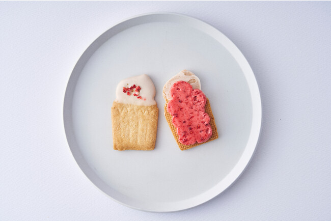 生クリーム入りのバタークリームに甘酸っぱい自家製いちごラズベリージャムを合わせ、ホワイトチョコレートをかけたビスケットで挟みました。フルーティーでジューシーな味わい。華やかなピンク色をした見た目の可愛さ。さっぱりとしながらも重厚感のあるミルキーな食べ心地です。