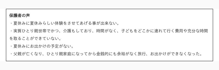 現代社会において、経済的貧困や社会的孤立等の困難な環境で生活する子どもたちに、夏休みの家族との体験の機会をお届けすることで、微力ながらこの格差に向き合い続けていきたいと考えています。