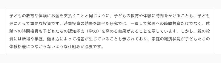 教育経済学が専門の中室牧子教授は、体験への投資が子ども達に与える影響について次のようにコメントしています。