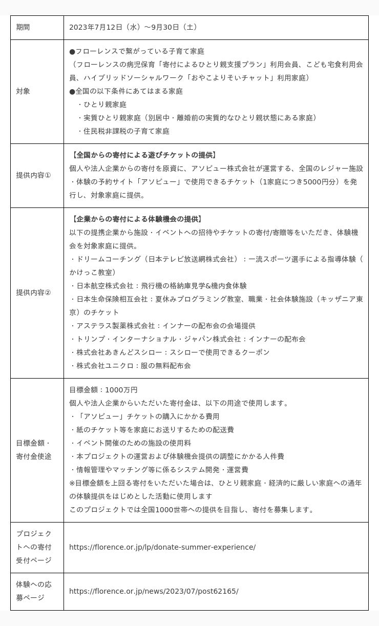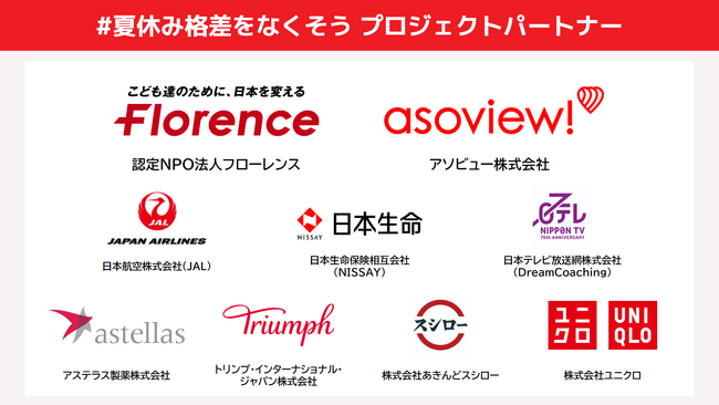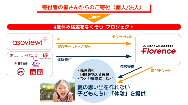 このプロジェクトでは、メインパートナーに日本最大級の遊び予約サイト「アソビュー」を運営するアソビュー株式会社を迎え、日本航空株式会社、日本生命保険相互会社、日本テレビ放送網株式会社、アステラス製薬株式会社、トリンプ・インターナショナル・ジャパン株式会社、株式会社あきんどスシロー、株式会社ユニクロ等と連携のもと、個人や法人企業から寄付を募り全国1000世帯に体験の機会を届けることを目指します。体験機会を提供することで、夏休み格差が埋まり、全ての子ども達が夏休みを楽しめる「新しいあたりまえ」の実現の一歩としたいと考えています。
