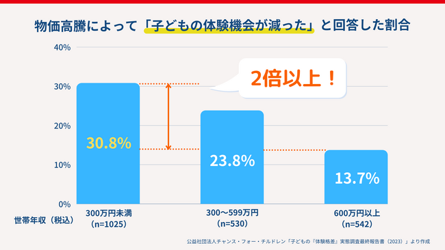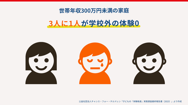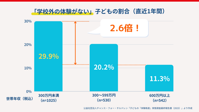 その中でも体験(文化鑑賞やスポーツ、習い事等子どもの心を豊かにする経験、旅行やお出かけ等の非日常的な体験等)の機会は、家庭の経済的状況によって大きな差があることが明らかになっています。公益社団法人チャンス・フォー・チルドレンの調査では、世帯年収300万円未満の家庭の子どもの約3人に1人が、1年を通じて学校外の体験活動を何もしていないこと、またその割合は世帯年収600万円以上の家庭と比較して2.6倍高いことがわかっています。