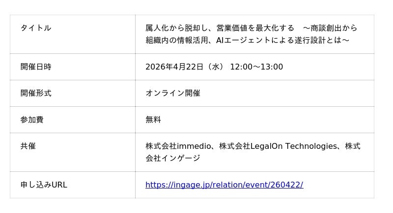 コミュニケーションプラットフォーム「Re:lation(リレーション)」を提供し、6,000社以上(※1)の導入実績を誇る株式会社インゲージ(本社:大阪府大阪市、代表取締役社長:和田 哲也)は、2026年4月22日(水)、株式会社immedio、株式会社LegalOn Technologiesと共同で、営業生産性の向上と属人化解消をテーマにした無料ウェビナーを開催いたします。