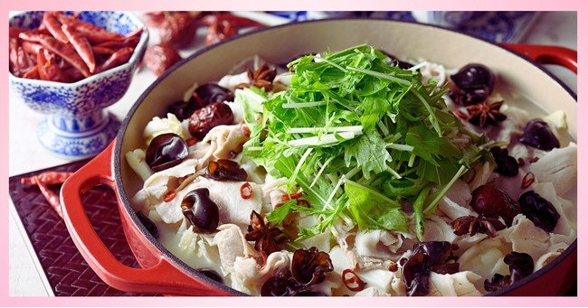 豚肉、白菜たっぷりの鶏白湯スープに「なつめ・八角・花椒」などのスパイスをプラス!カラダぽかぽかヘルシーな『薬膳風火鍋』。